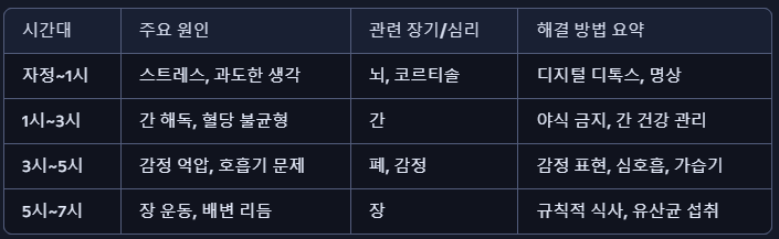 시간대 주요 원인 관련 장기/심리 해결 방법 요약
