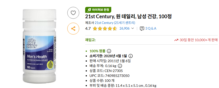 21st Century 원데일리 남성 비타민은 가격 대비 성분 구성이 우수하고, 남성 건강을 위한 기본적인 영양 보충에 적합한 제품입니다. 특히 지금 아이허브에서 세일 중이라 가성비와 간편한 복용법을 중시하는 분들에게 추천할 만한 선택지입니다.