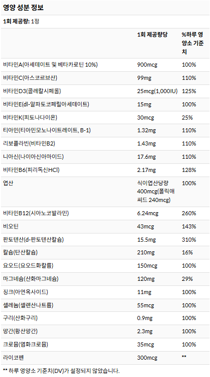 마침 세일중이라 100 정의 멀티 비타민을 진짜 말도 안 되는 가격 6천 원에 살 수 있었습니다. 그렇다고 가성비만 좋은 게 아니니 아래쪽 성분 등 정보까지 확인해 보시기 바랍니다~